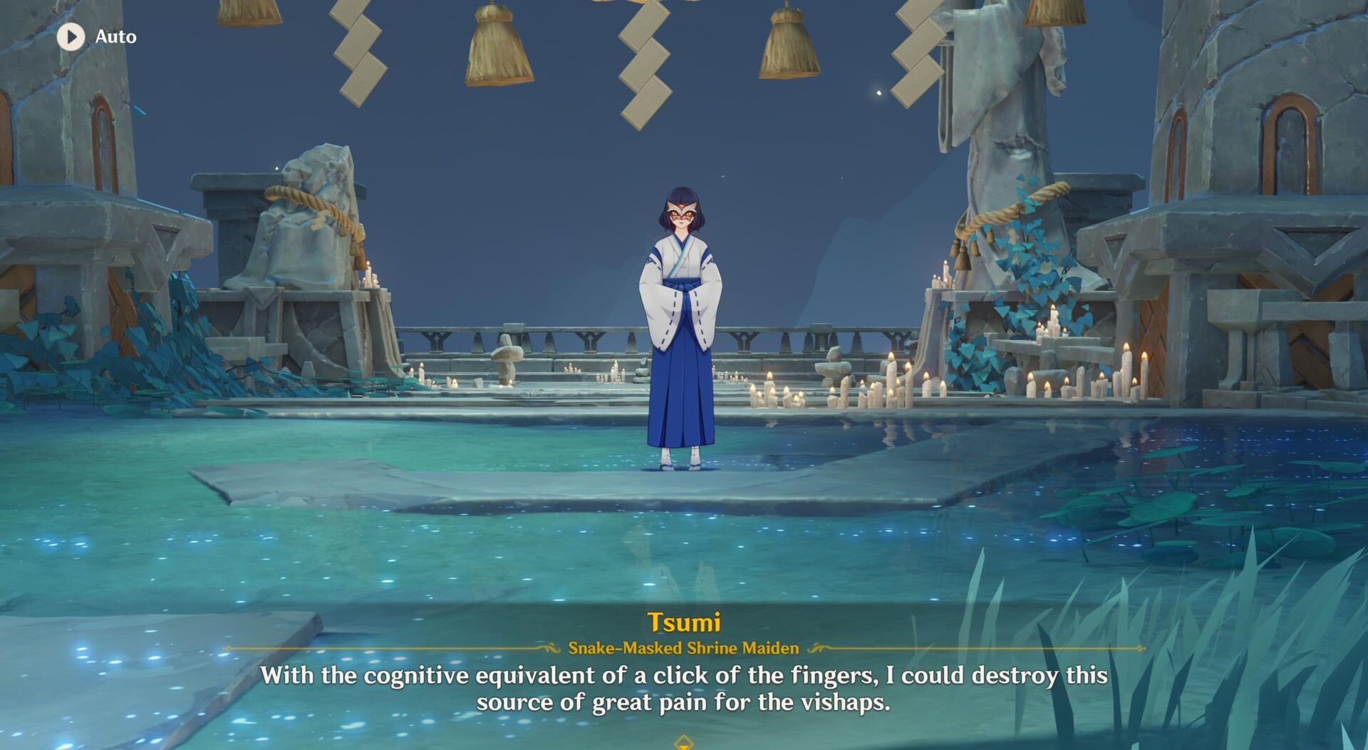 The first is that she belongs to the Vassals of Watatsumi, who were half-human, half-snake. In essence, these species look like humans, but their eyes have vertical pupils and they can communicate with Bathysmal Vishaps. Tsumi hides such pupils under the mask, and can also communicate with Bathysmal Vishaps.