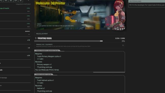 Printing item caches cost BTC, with the cost increasing exponentially depending on the rarity of the cache. Once you print a cache, you’ll receive the corresponding item with a level that is directly equal to your printing rank, and the cache is consumed in the process.