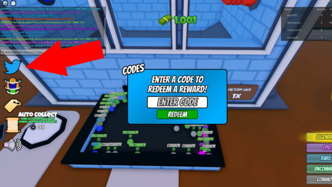 Redeeming prize codes in Rarity Tycoon Factory is very easy to do. First off, log into the game. When you’re in, look on the left side of the screen, and you should see a Twitter icon, so tap or click on it to bring up the code redemption box.
