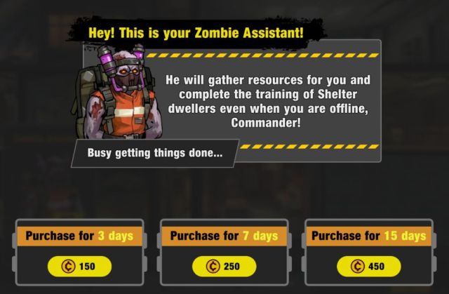 In case you don’t know what the Zombie Assistant does in Zero City: Zombie Shelter Survival, here’s the rundown: it will automatically collect resources when you are away and it will complete the training of your Shelter dwellers when you are around.